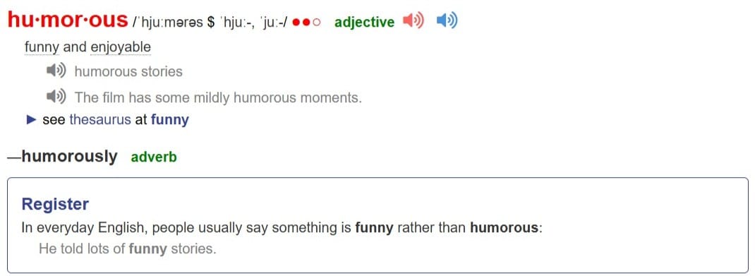 برای مثال در بخش رجیستر نوت کلمهی humorous اینطور نوشته شده است: